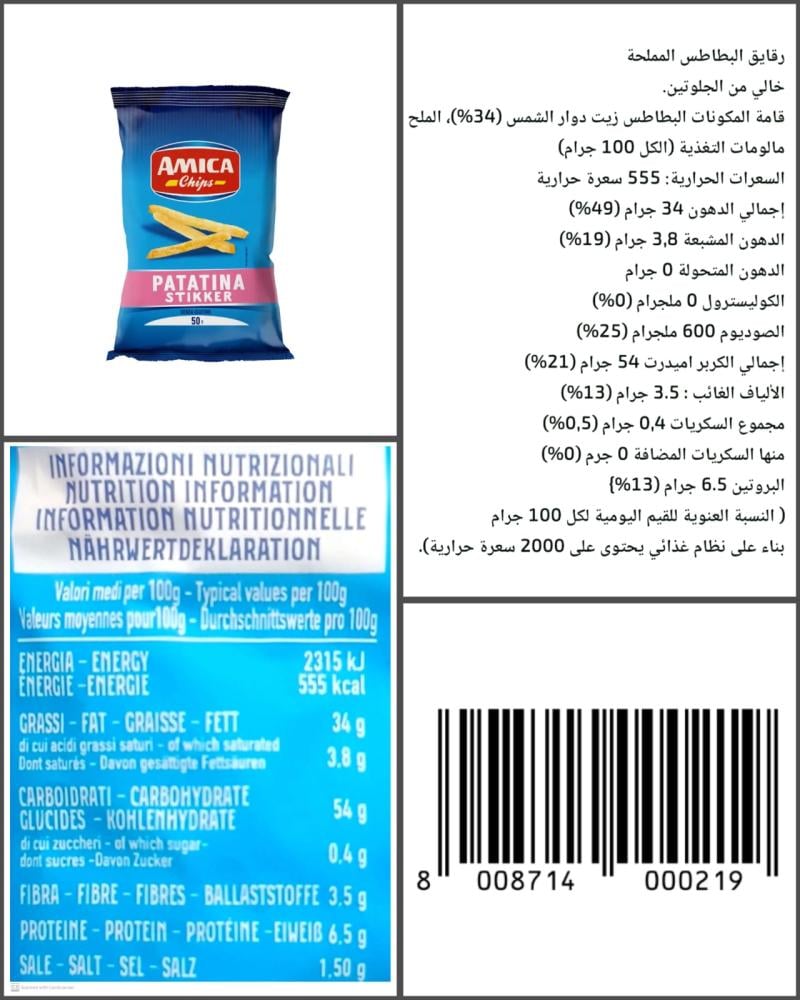 تعتبر شرائح لاصقة أميكا مثالية لأولئك الذين يبحثون عن وجبة خفيفة مقرمشة ولذيذة ليحملوها معهم دائمًا. شكلها المطول يجعلها ألذ وأكثر متعة في تناولها، بينما تضمن الوصفة الفريدة والأصلية تجربة تذوق مكثفة. مثالية لمرافقة فاتح للشهية أو وجبة خفيفة سريعة في المكتب، تعد Stikker Amica Chips خيارًا ممتازًا لأولئك الذين يرغبون في الاستمتاع بلحظة من المتعة الخالصة.