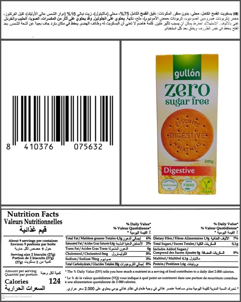 دقيق القمح ، محليات (إيزومالت ومالتيتول)، زيت نباتي (دوار الشمس عالي الأوليك)، نخالة القمح ، أوليجوفركتوز، عوامل رافعة (كربونات هيدروجين الصوديوم وكربونات هيدروجين الأمونيوم)، ملح.