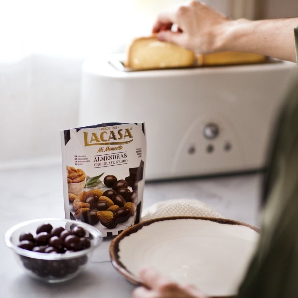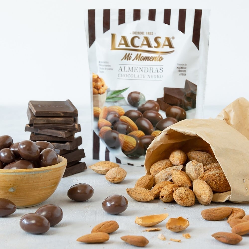 لوز محمص لذيذ مغموس في شوكولاتة لاكاسا الداكنة.